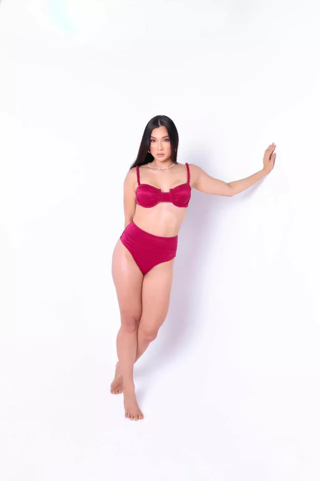 Biquíni cintura alta, com pala que valoriza a silhueta e acabamento embutido. Meio fio. O top possui alças reguláveis em torçais e aspas. Não possui bojo.