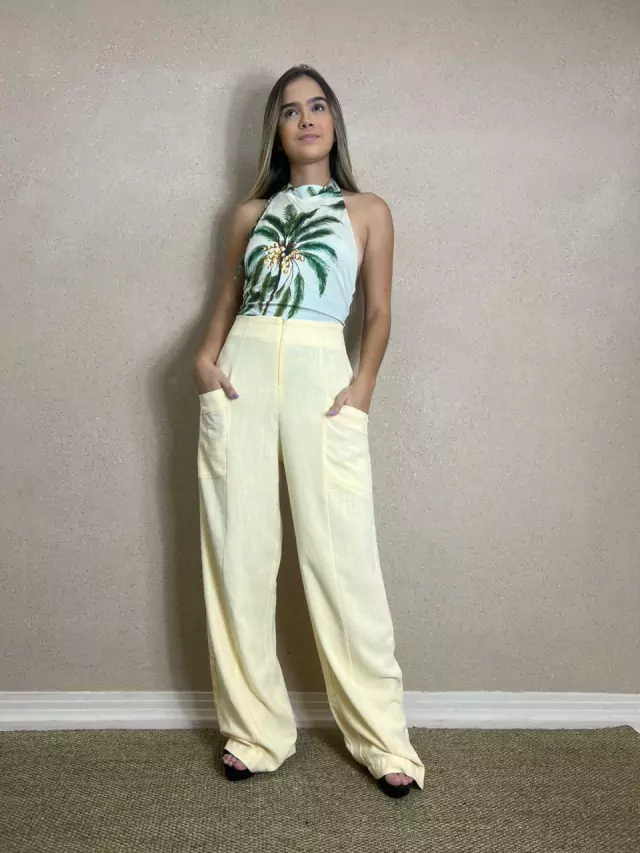 SAÍDA , calça modelo pantalona alfaiataria em linho com viscose ,com bolsos frontais , botão e ziper, cós das costas tem elástico largo que além de permitir melhor ajuste também modela a slhueta feminina, o desing permite usa-la em diversas ocasioões além do beachwear. Lycra UV 50+ trilobal, com leve brilho.