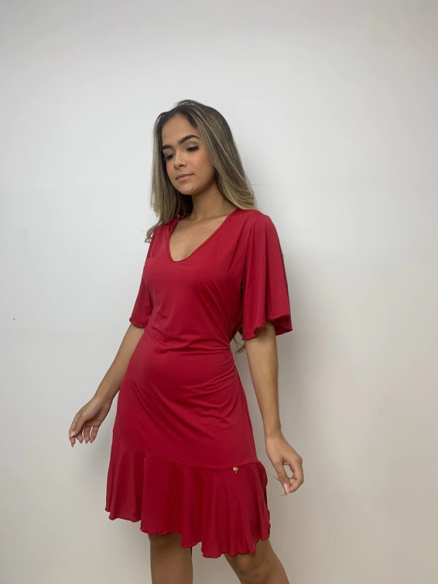 O vestido Rafaela é confeccionado em microfibra leve. Esse modelo possui mangas curtas, regulagem na cintura, babado na barra, e comprimento curto.