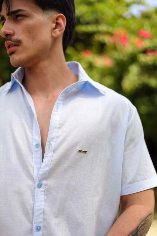 Coleção Destinos, estampa Arabesco. Camisa de botão unissex, mangas curtas e bolso frontal.