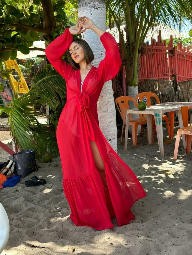 Saída longa em crepe fluído, com babados detalhe no busto com drapeado, mangas bufabtes com ombros estruturados faixa na cintura para fechar e acinturar